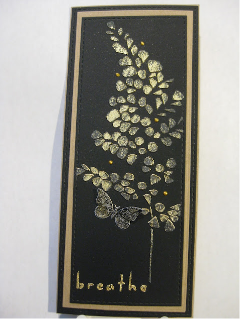 To enhance the leaves, I took a small, flat rubber stamp having no image, inked it up, and skimmed it over the very dimensional dry embossed leaves. A navy blue branch in a dry embossed vase, a few clusters of sparkly leaves, and we’re done!